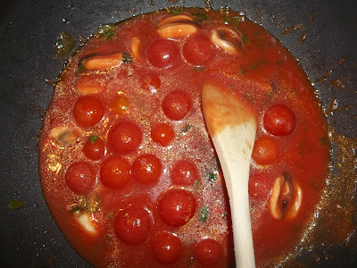 A questo punto non vi resta che aggiungere i pomodori, un bicchiere di liquido rilasciato dalle cozze ed il sale. Fate cuocere per circa 15 minuti a fuoco lento!