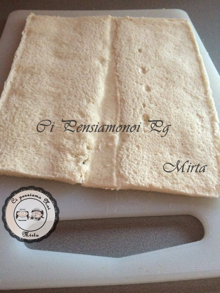 Prendere le fette di tramezzino e sovrapporle per il lato lungo se necessario bagnare i bordi con un pochino d’acqua, Passare il mattarello e appiattire in un modo da formare un unico foglio di pane.