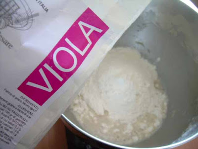 In un’ampia ciotola o nella ciotola della planetaria sciogliere il lievito con l’acqua tiepida, aggiungere la Farina Viola,