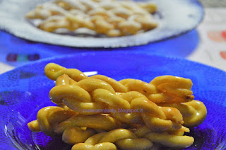 Friggerli gli Acciuleddi in olio di semi di arachidi o strutto fino a che non siano ben dorati, sgocciolarli su carta assorbente, quindi spolverizzare di zucchero al velo, oppure scaldare bene il miele (per mezza dose ne ho usato due cucchiai abbondanti) in un pentolino, aromatizzare con la scorza d’arancia grattugiata e il succo di metà dell’arancia (o con la pasta d’arancia) e aggiungere gli acciuleddi, mescolando con delicatezza un cucchiaio di legno e farli rivestire bene di miele.