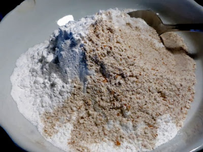Porre le farine mescolate con il sale e il bicarbonato nel boccale del mixer e azionarlo per pochi secondi..