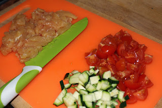Cut the chicken into small pieces and do so also with 2 zucchini.
