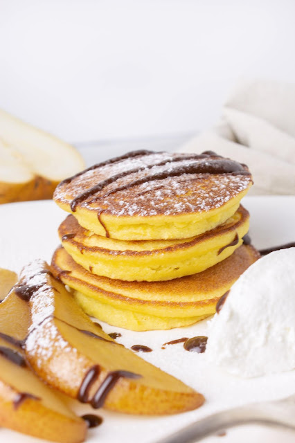 Chi mi conosce sa del mio amore viscerale per la ricotta e anche in questa preparazione sta davvero benissimo!! Difatti rende i pancake super soffici! Dovete assolutamente provarli. E l’abbinamento pere e cioccolato? Beh mi piace vincere facile :-). In realtà questo accompagnamento serve ad arricchire la nostra colazione, di fibre, vitamine e grassi buoni (quelli del cioccolato o della frutta secca se scegliete una buona crema di nocciole e cacao). Ma veniamo alla ricetta.