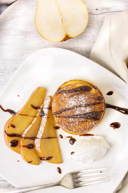 Servire i pancakes con una quenelle di ricotta, le pere caramellate e la salsa al cioccolato che potete ottenere miscelando del cioccolato fuso con un goccio di latte oppure miscelando della crema di nocciole e cacao sempre con un goccio di latte per renderla più fluida. Buona colazione!