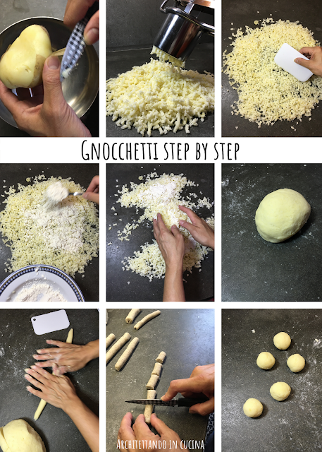Preparare gli gnocchi seguendo le indicazioni di questo post, dove le patate per gli gnocchi sono cotte al microonde, se volete cuocerle in forno, la ricetta giusta è questa. Se volete bollirle, tempi e modi li troverete qui