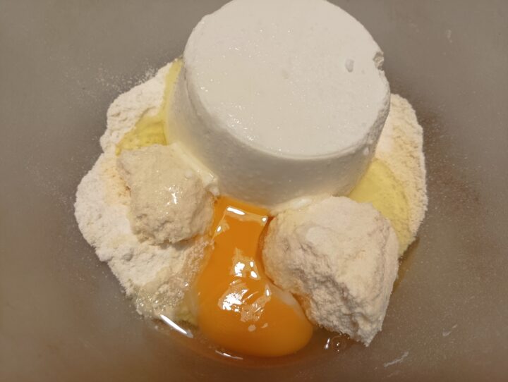 Versare in una ciotola la ricotta, la farina, il parmigiano, l’uovo ed un pizzico di sale.