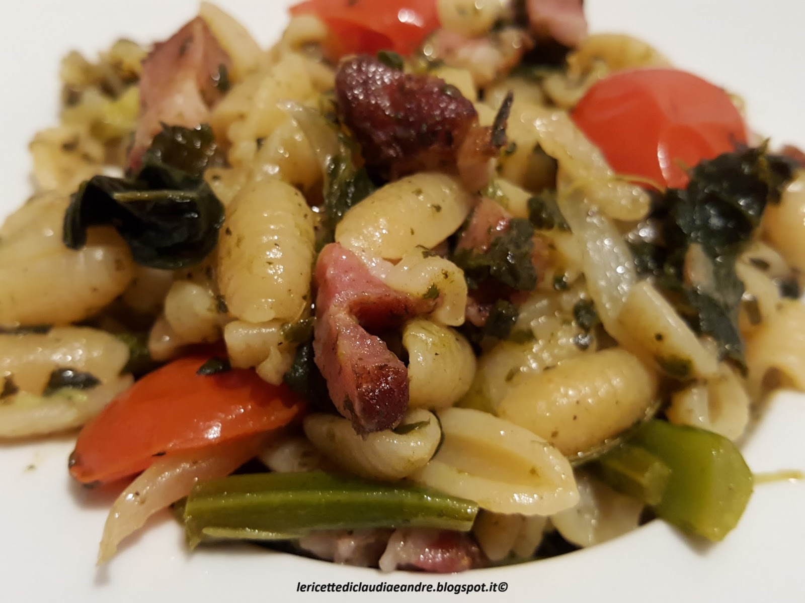 Gnocchetti sardi con pancetta affumicata, cavolo nero e pomodorini