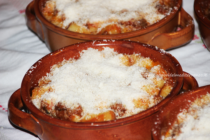 Adagiate in un tegamino prima tre cucchiai di ragù, poi gli gnocchi e infine distribuite un pò di parmigiano reggiano grattugiato.