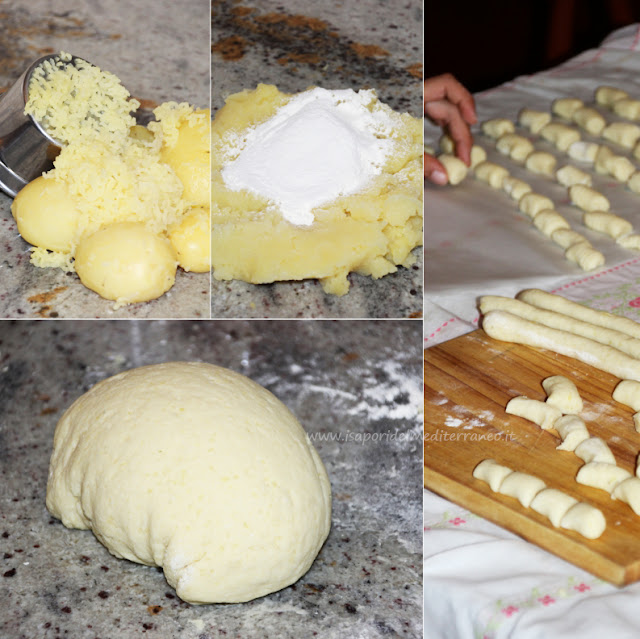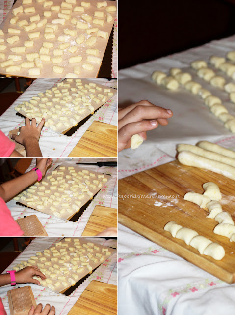 Una volta formata una pagnotta tagliatene dei pezzi con i quali ricavare dei filoncini che allungherete con le mani, facendoli roteare sulla spianatoia fino allo spessore di circa 1.5 cm poi tagliateli in gnocchi di circa 2 cm. Passate ogni gnocco sui rebbi di una forchetta, esercitando una certa pressione farli scorrere dal basso verso l’alto oppure usare un riga gnocchi, in questo modo assumono la caratteristica rigatura e si formerà l’incavo che accoglierà il sugo. Non li infarinate troppo altrimenti risulteranno appiccicosi, eventualmente usate della farina di riso che in acqua si scioglie completamente.