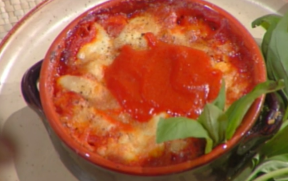 In un tegame di terracotta condire gli gnocchi con il sugo, aggiungere il fior di latte e la caciottina tagliate a cubetti e spolverare il tutto con il formaggio grattugiato.