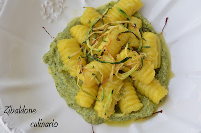 Servire nel piatto di portata su un letto di crema di zucchine e ricotta, decorare con le zucchine fritte e qualche pistillo di zafferano.