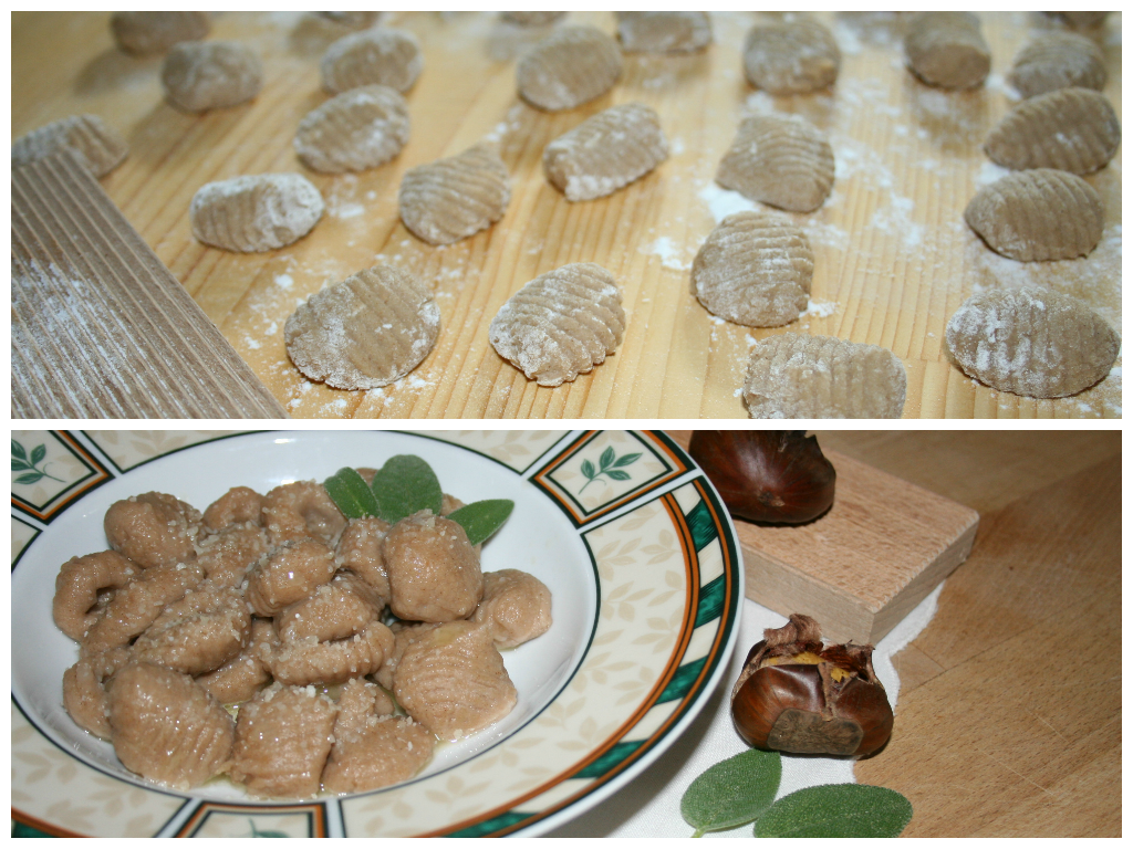 Portare ad ebollizione l’acqua un po’ salata e con un cucchiaio di olio d’ oliva. Appena l’acqua è pronta velocemente, aiutandosi con una frusta, aggiungere le farine precedentemente mescolate senza formare grumi, fino ad ottenere un impasto omogeneo. Scaldare per un circa 1 minuto continuando a mescolare con un cucchiaio di legno. Togliere il composto, portarlo sulla spianatoia infarinata e lavorarlo velocemente, facendo attenzione perchè è caldo. Formare dei rotolini e tagliarli a tocchetti.