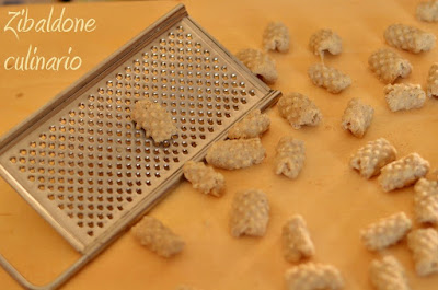 Impastare velocemente, formare un filone e poi tagliare con il tarocco tante fette, con le mani ricavare delle bisce dello spessore di circa 1,5cm che poi verranno tagliate a circa 2 cm.