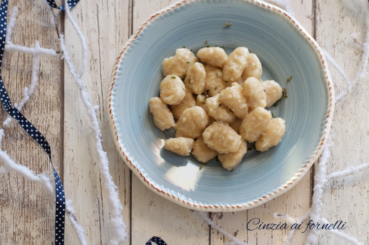 - Fate cuocere gli gnocchi in abbondante acqua salata, quando verranno a galla, scolateli e fateli rosolare leggermente in una padella con una noce di burro, cospargete col grana e terminate con foglioline di timo fresco.