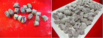 A questo punto possiamo iniziare a tagliare i nostri gnocchi viola della larghezza di circa 2 cm. Possiamo lasciarli così (per adesso la moda alimentare predilige la forma “al naturale”) oppure passarli su di una forchetta per dargli la classica forma rigata. Io ho optato per la prima versione ma voi potete scegliere quella che preferite. Infariniamoli per bene quindi trasferiamoli su di una pirofila cosparsa di farina per evitare che si attacchino fra di loro e nel contenitore. Lasciamoli riposare 10′ prima di cuocerli.