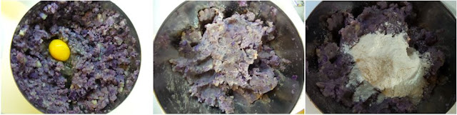 Appena avremo schiacciato tutte le patate viola, aggiungiamo l’uovo, il sale ed amalgamiamo il tutto. Terminata questa fase, iniziamo ad incorporare, poco alla volta, la farina.