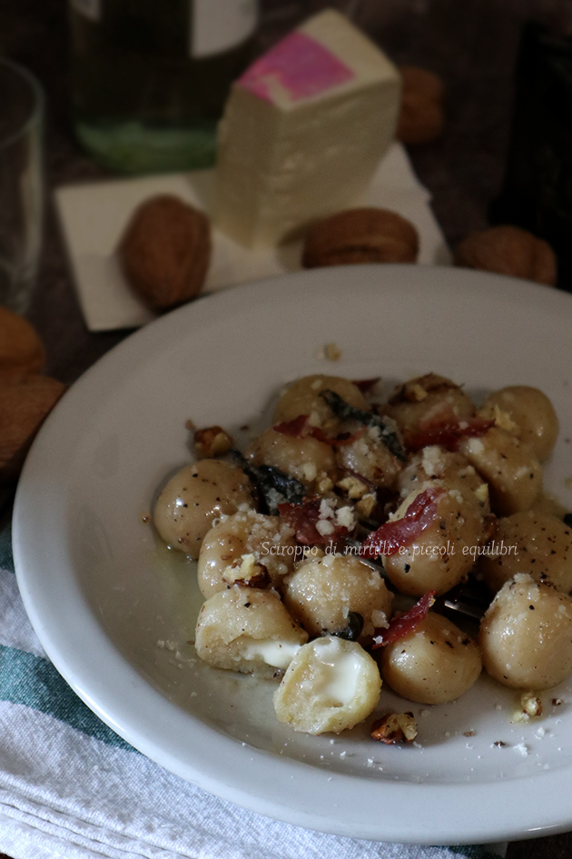 Ho condito gli gnocchi con burro, salvia, speck croccante e gherigli di noci.