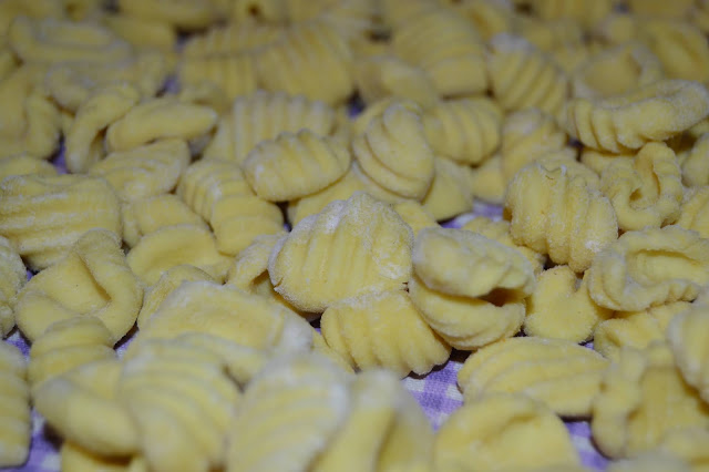 Amalgamare bene fino ad ottenere un impasto liscio, ricavare dei cilindri larghi un dito, tagliarli a tocchetti di due cm e passarli sui rebbi di una forchetta, mettendoli su un vassoio coperto con un canovaccio e cercando di farne un solo strato per non ammassarli.