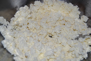 Per gli gnocchi: mettere la ricotta in una ciotola e lavorarla bene per ammorbidirla, poi unire la farina, la curcuma e il pizzico di sale.