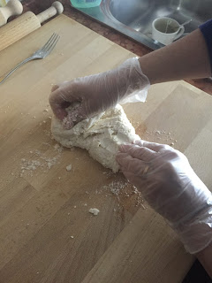 Continuare a mescolare e quando il composto è un po’ più consistente trasferirlo sulla spianatoia leggermente infarinata; il composto risulterà un pochino appiccicoso ma è normale, personalmente cerco di aggiungere il meno possibile ulteriore farina, giusta la quantità necessaria per riuscire a lavorare.