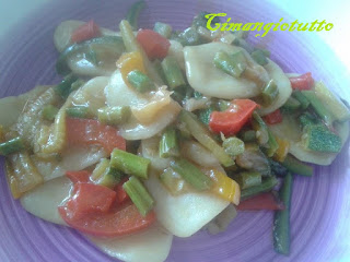 Unire i peperoni a listarelle o a cubetti, farli saltare a fiamma vivace per cinque minuti, unire le zucchine sempre tagliate a listarelle e le punte di asparagi (precedentemente sbollentate) e far cucoere per altri cinque minuti.