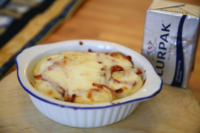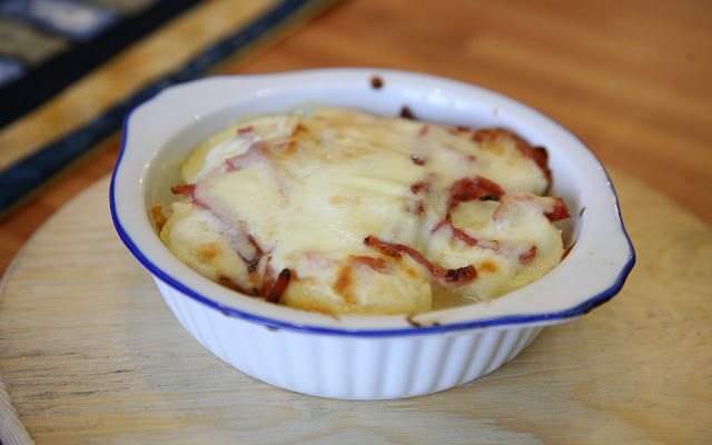 Sul fondo di una pirofila da forno mettere due cucchiai di besciamella, uno strato di gnocchi di semolino, speck, besciamella e scamorza affumicata grattugiata. Procedere con un secondo strato terminando con la scamorza grattugiata.