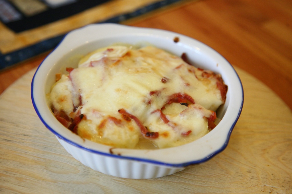 Sul fondo di una pirofila da forno mettere due cucchiai di besciamella, uno strato di gnocchi di semolino, speck, besciamella e scamorza affumicata grattugiata. Procedere con un secondo strato terminando con la scamorza grattugiata.