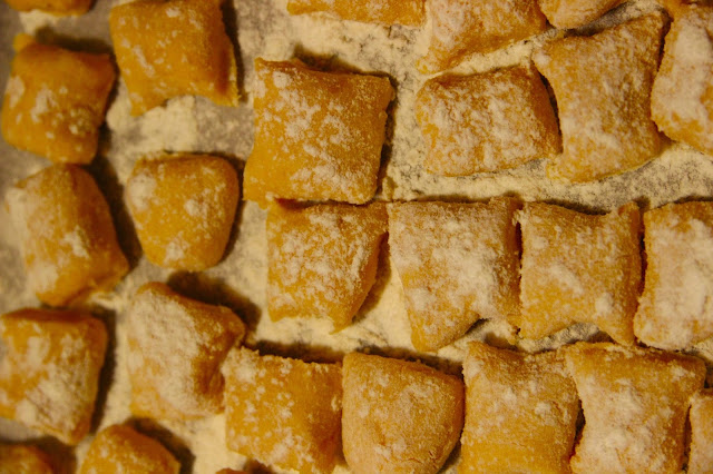 Con l’impasto formate dei cordoncini e tagliate da ogni cordoncino i gnocchi e disponeteli in un vassoio ben infarinato per non farli attaccare.