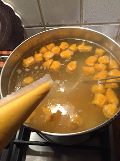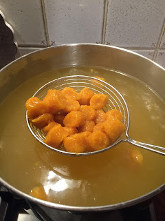 Una volta raggiunto il bollore, formare gli gnocchetti, facendo uscire il composto dalla tasca e tagliandoli con un coltello (io con le forbici) e tuffarli nella pentola.
