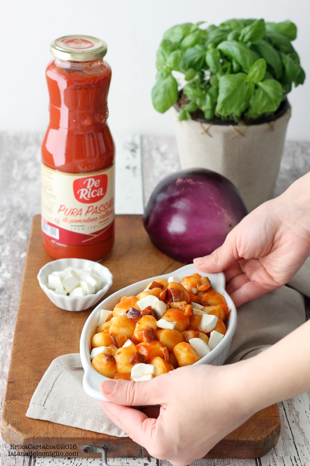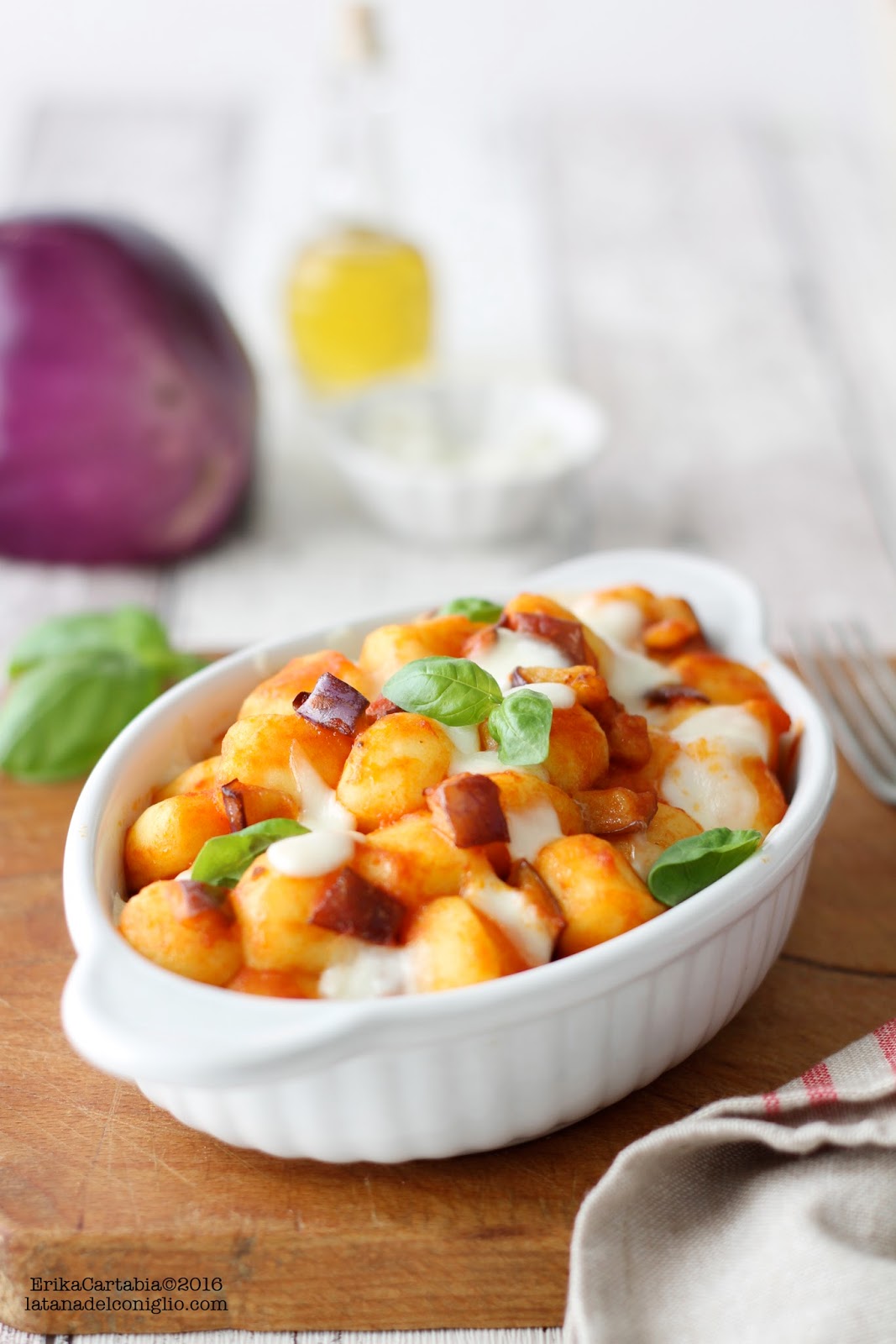 Fate cuocere gli gnocchi in abbondante acqua salata portata a bollore. Non appena affioreranno in superficie toglieteli con una schiumarola. Conditeli con il sugo di pomodoro e melanzane e trasferite il tutto in una pirofila. Riducete a pezzetti la mozzarella di bufala, ben scolata dal suo liquido e unitela agli gnocchi. Fate cuocere in forno ben caldo a 200°C per circa 5-7 minuti o almeno fino a quando la mozzarella non risulterà ben filante. Servite con qualche fogliolina di basilico.