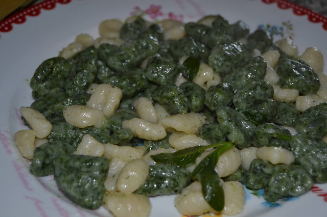 Mettere la ricotta in una ciotola e lavorarla bene per ammorbidirla, poi unire 300 g di farina e il pizzico di sale. Dividere l’impasto in due ciotole differenti e in una aggiungere gli spinaci e i 50 g di farina rimasti.
