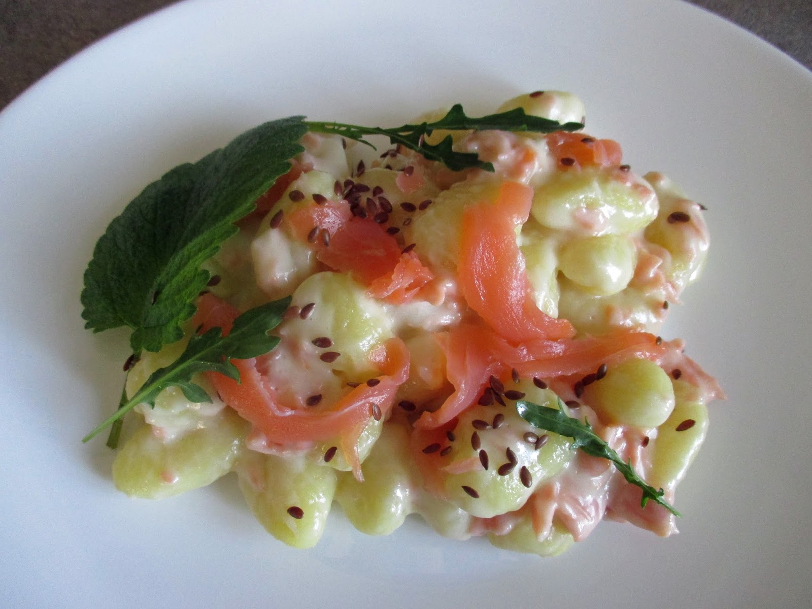 Cut lists salmon. In a pot, boil the water, then immerse the gnocchi. When they are ready, transfer them to the bowl with the salmon, flax seeds and finally the stracchino. Mix well and serve immediately.