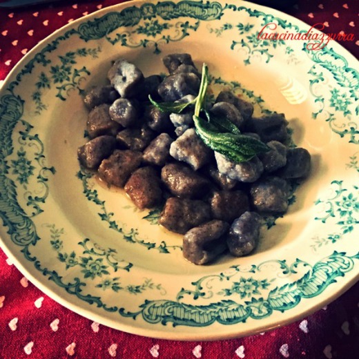 Potrete condirli con burro e salvia, secondo me l’abbinamento più giusto, perchè la semplicità del condimento esalterà il gusto dei vostri gnocchi viola!