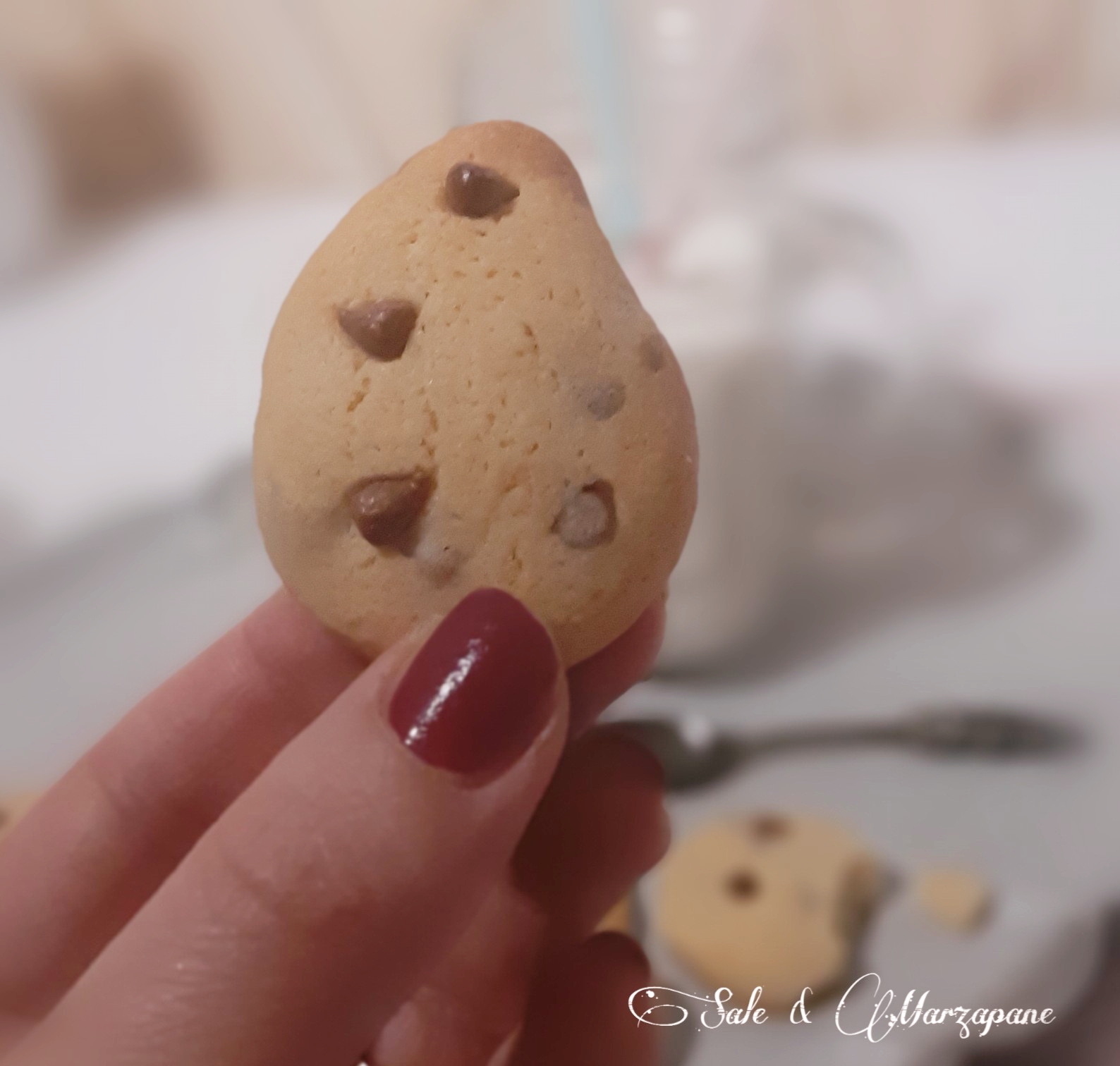 Solo alla fine unite le gocce di cioccolato ed impastate velocemente e per poco in modo da evitare che le gocce si sciolgano con il calore delle mani.