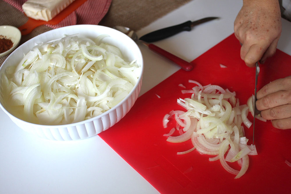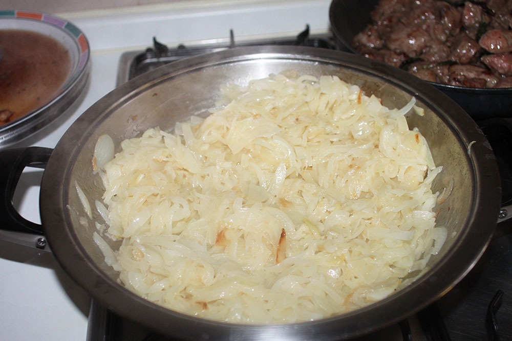 English. Finely slice the onions. In a large pan melt the butter and make the onions turn golden for about 20 minutes. Slowly simmer: pay attention they do not turn burnt.