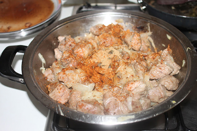 Español. Cuando la cebolla esté bien dorada y se han puesto casi transparente, añadir la carne a la cacerola. Unir los pimentónes en polvo y el comino. Revolver y cocinar a fuego alto. Añadir el vino, revolver y dejar que se evapore. Cocinar durante unos diez minutos a fuego alto.