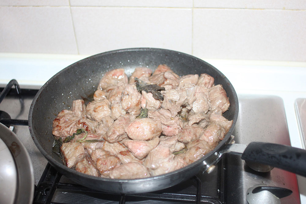 English. Take another skillet and place 4 tabsp. of olive oil in it. Add some sage leaves and some sprig of rosemary and gently fry on low heat for three minutes. Then turn on the heat and sauté the meat, a bit amount at a time (not all together otherwise it will get boiled!). Stir-fry only a few minutes the meat chunks, just the time to make them change their colour. Set aside.