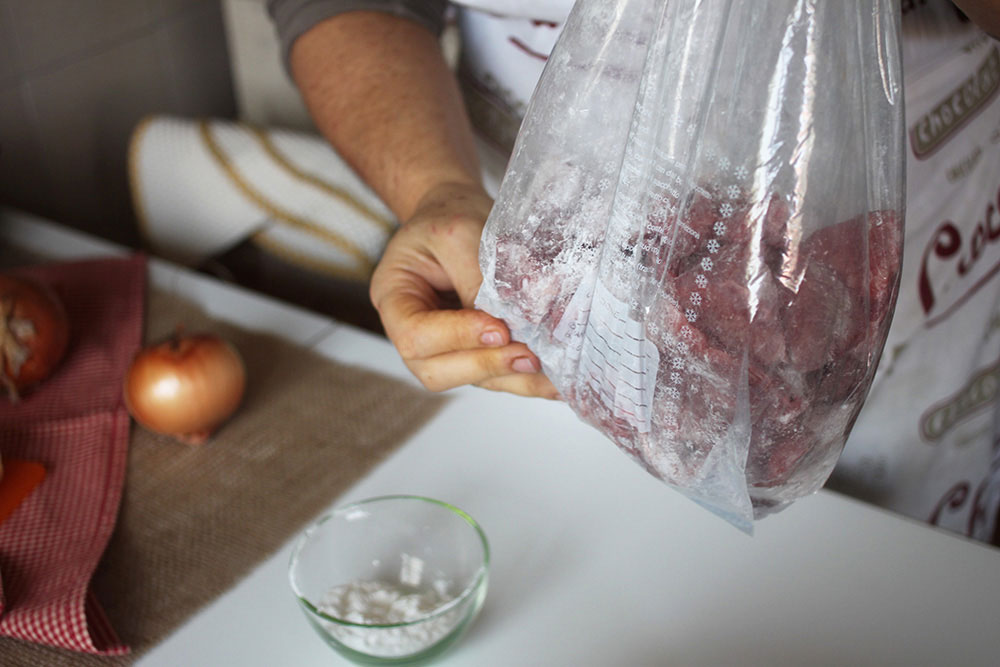 Español. Cortar la carne en cubos grandes (alrededor de 3 cm por cada lado). Poner la harina de maíz (maizna) en una bolsa y añadir la carne. Agitar vigorosamente para asegurarse de que todos los cubos de carne sean velados de harina.