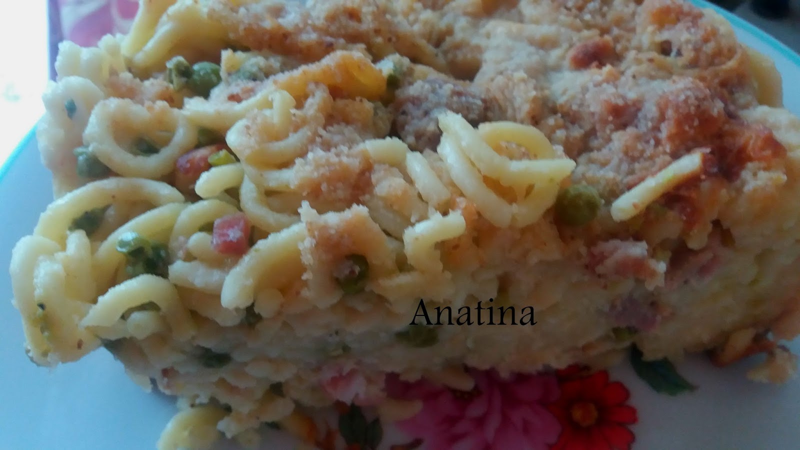 con salsicce,provola, piselli e grana grattugiato,ricopriamo con la restante pasta ,besciamella,grana