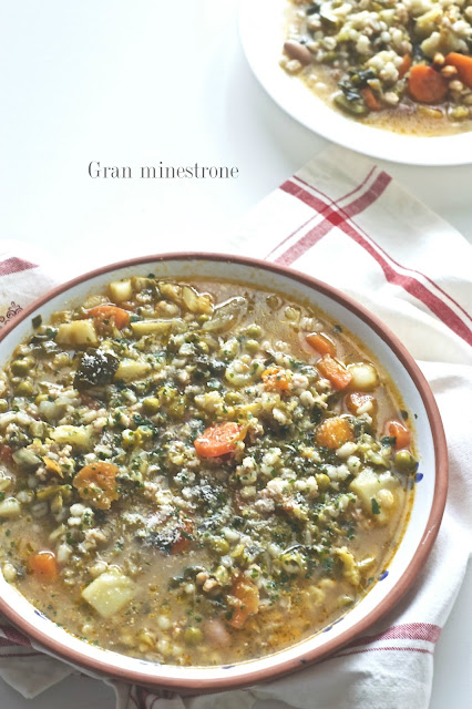 Perché ” Gran minestrone ” ?! perché oltre al gran numero di verdure è arricchito da orzo e farro che insieme alla patata formeranno una bella cremina e renderanno il vostro minestrone ancora più ricco e goloso ma se non amate questi cereali potete sempre aggiungere in alternativa della pasta corta o del riso.