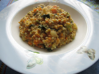 Tagliare a cubetti piccoli zucca e patate e tagliare il broccoletto tenendo i germogli morbidi ed eliminando la parte più dura. In pentola aggiungere un filo d’olio e le verdure. Lasciar cuocere una quindicina di minuti, aggiungendo acqua dopo un po’ e mescolando di tanto in tanto. Aggiungere il grano saraceno e le lenticchie ed altra acqua per far cuocere il grano saraceno. Dopo 18 minuti, aggiungere il formaggio arancione (Ricetta del formaggio qui), salare e lasciar cuocere mescolando un altro paio di minuti.