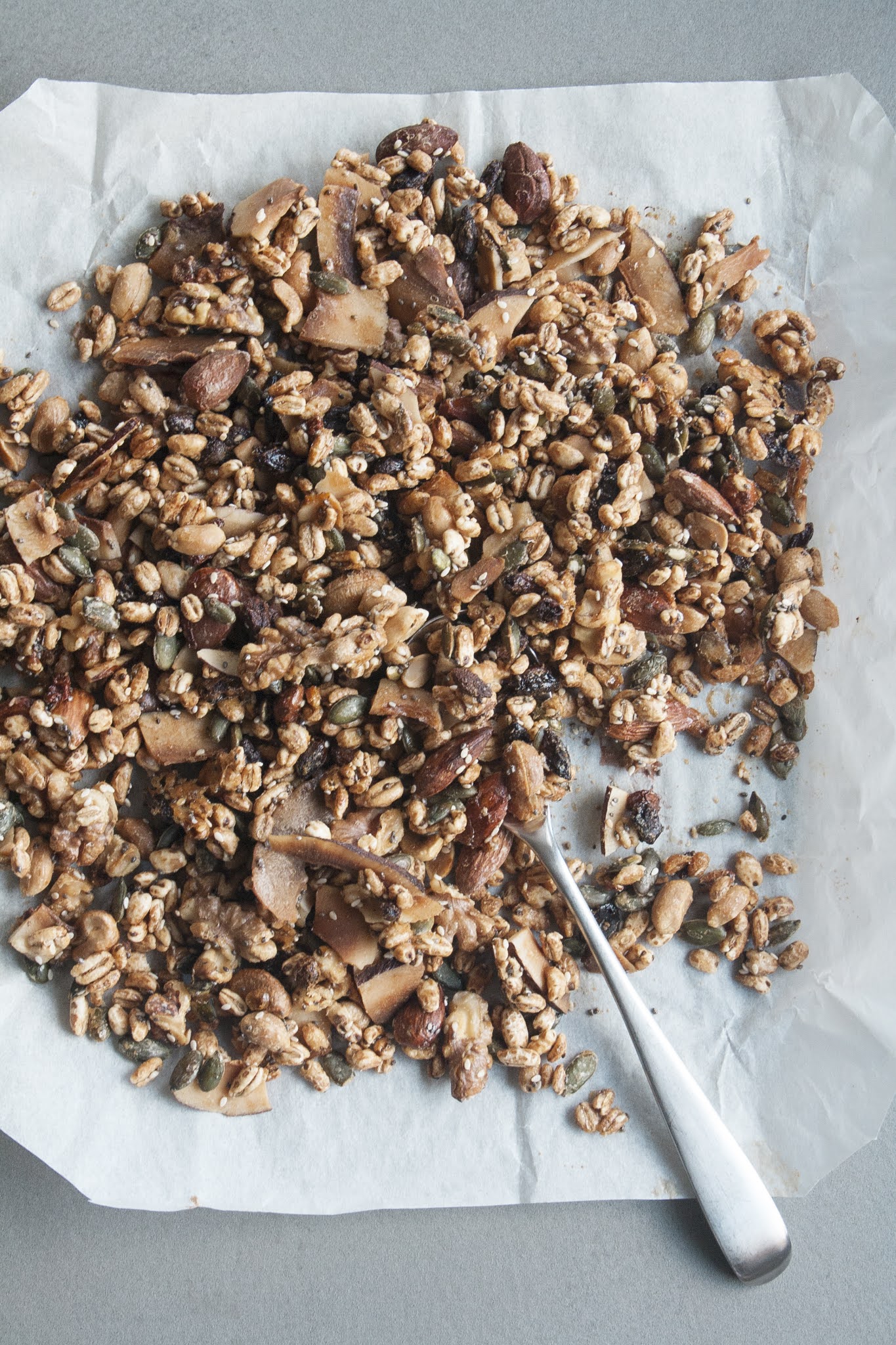 La granola di orzo soffiato fatta in casa è una miscela che viene tostata al forno a base di frutta secca, orzo soffiato e semi arricchita con sciroppo d’acero.