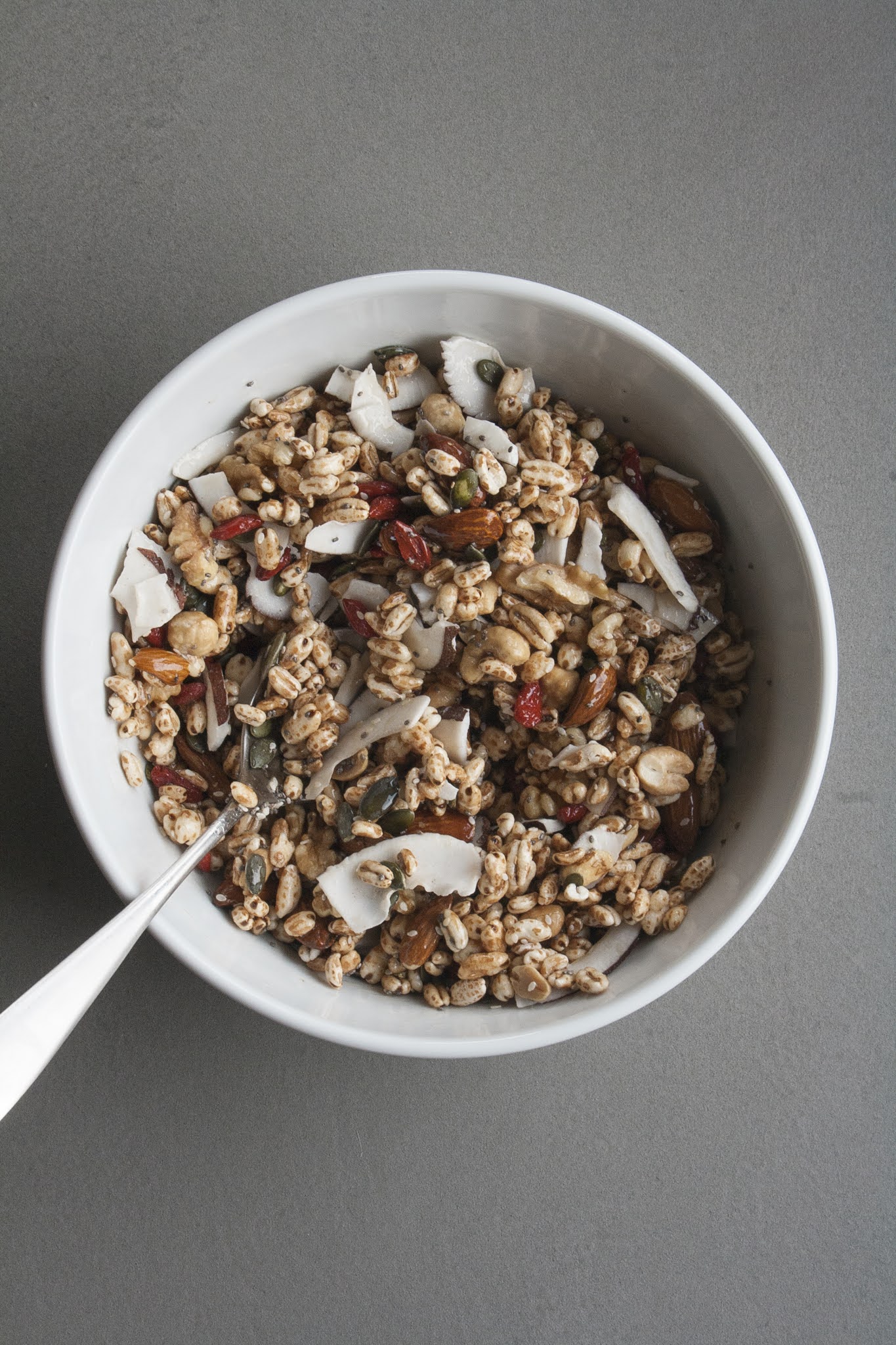 La granola di orzo soffiato fatta in casa è una miscela che viene tostata al forno a base di frutta secca, orzo soffiato e semi arricchita con sciroppo d’acero.
