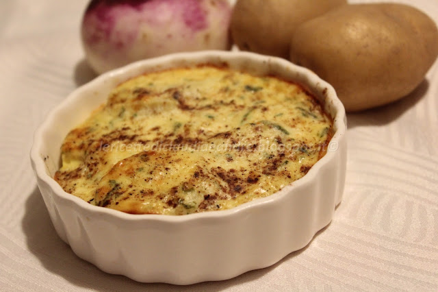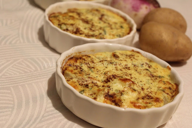 Distribuire questa crema versandola in ogni teglietta in modo da velare bene le rape e le patate a fette, per me forse ci stava 2 cucchiai di latte in più, visto che ho abbondato con i formaggi. Dare un’ultima grattatina di noce moscata o spolverizzare quella in polvere ed infornare nel forno preriscaldato a 180°, per i primi dieci minuti tenere il forno con funzione statica, poi altri 13- 15 minuti nella funzione ventilato per dorare bene la superficie; Dipende molto da forno a forno !