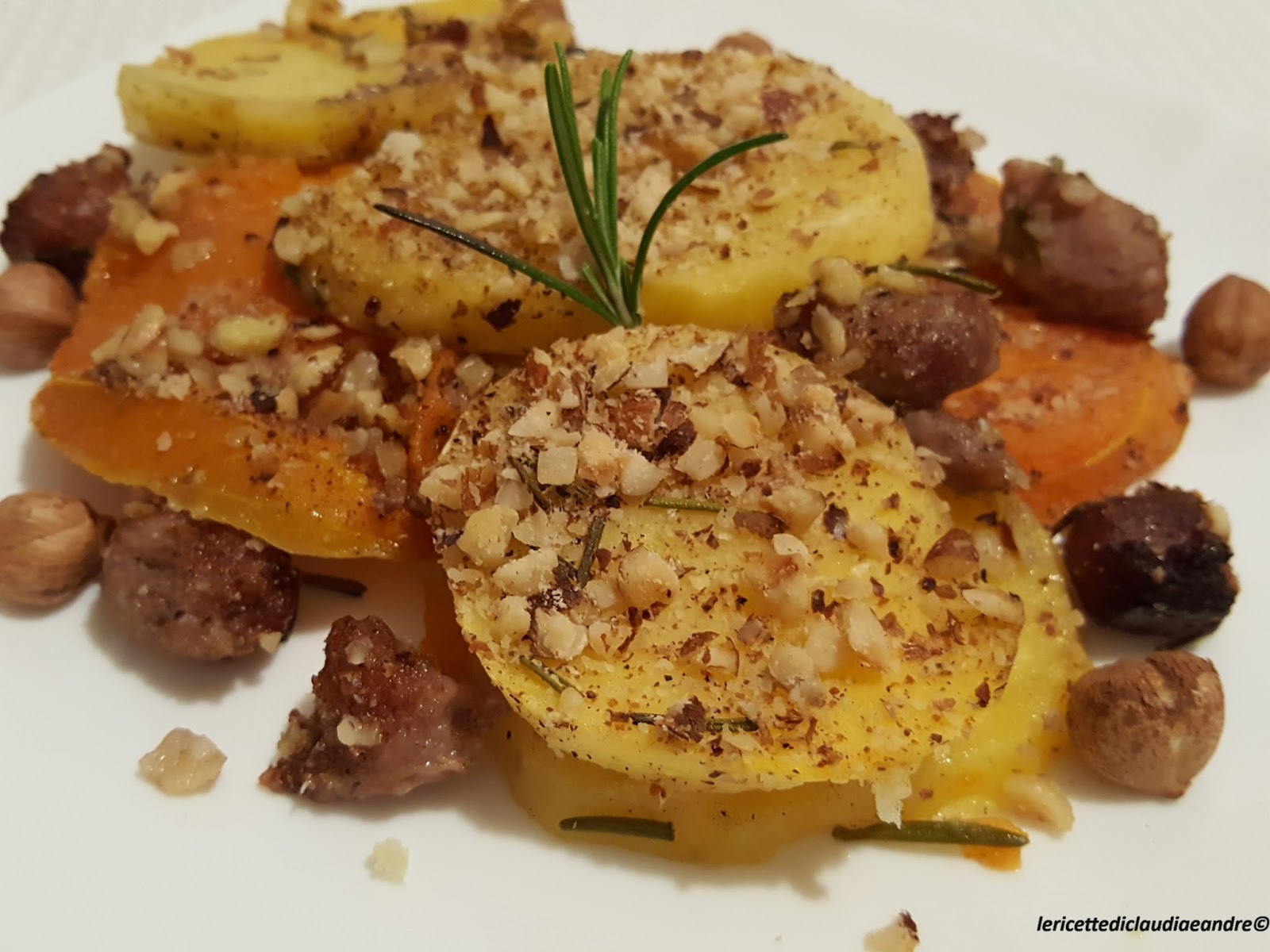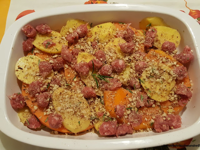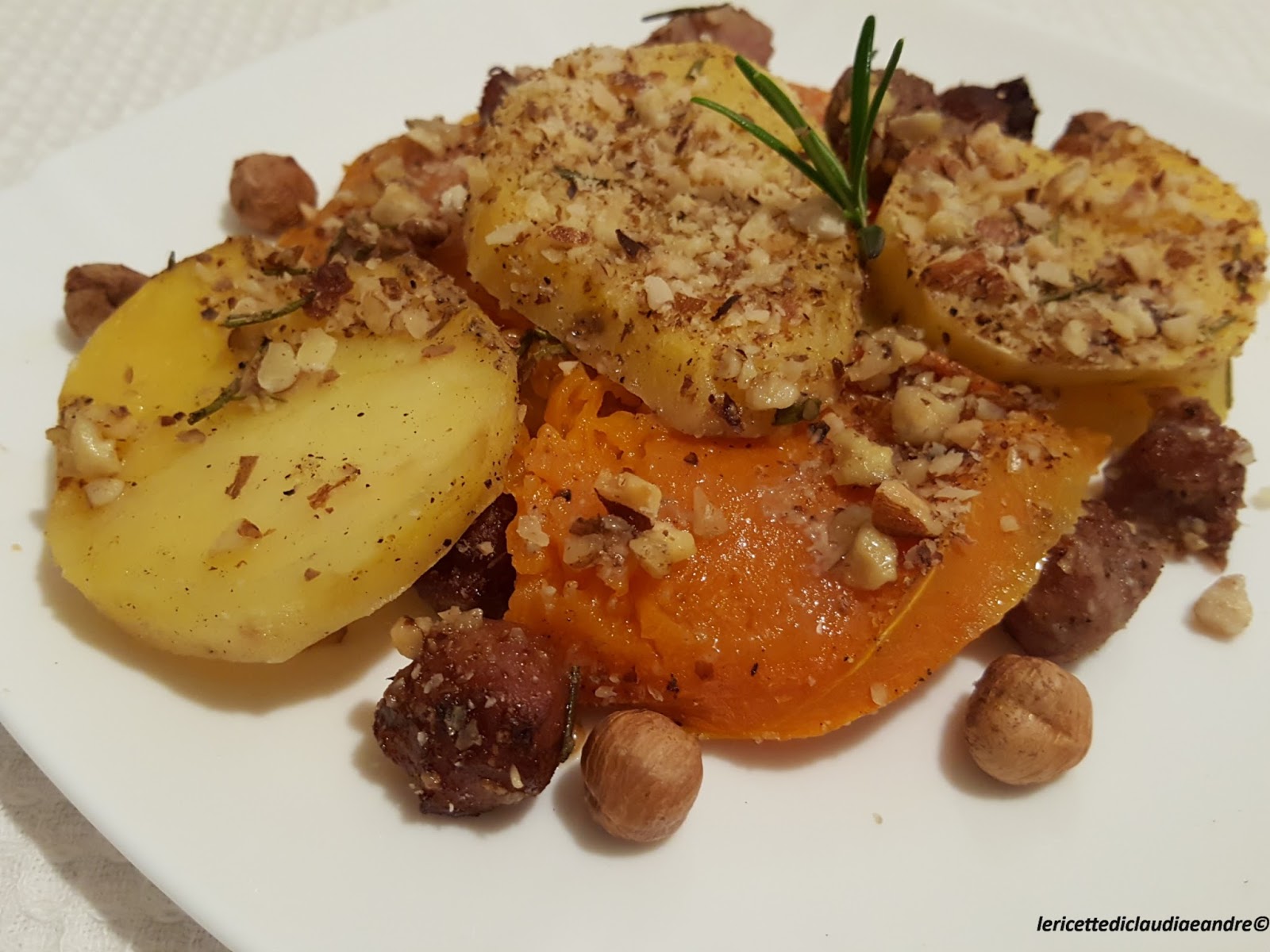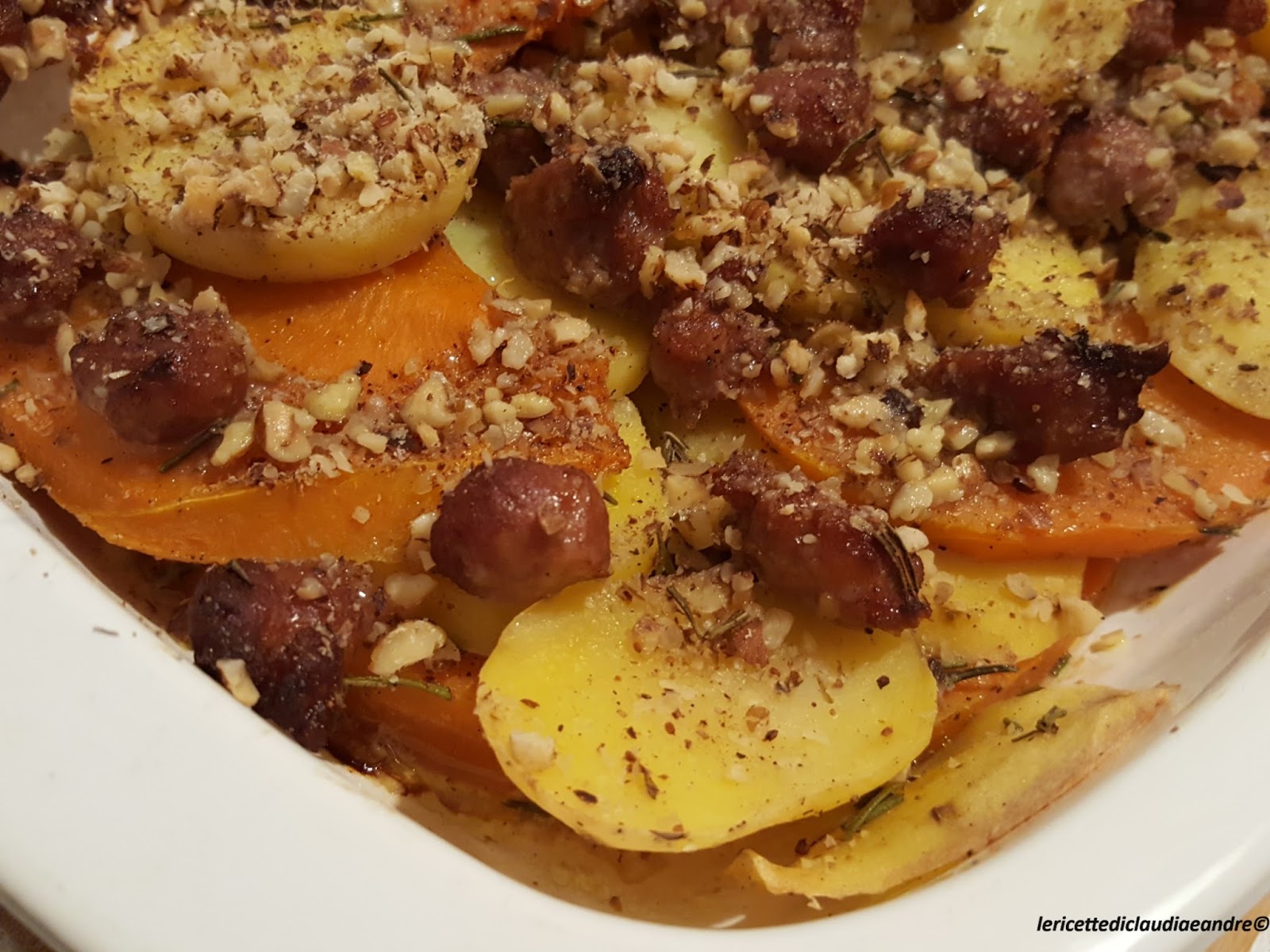 Gratin di zucca al forno con patate, salsiccia e nocciole