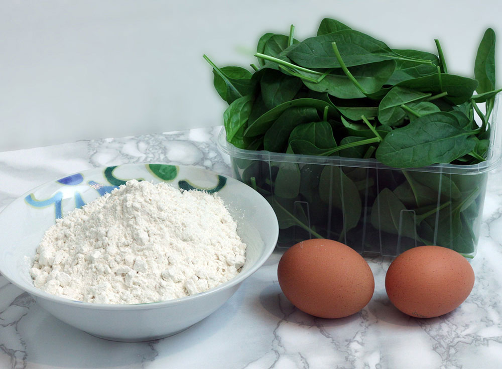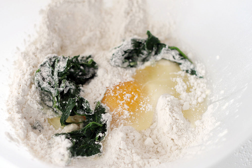 Divide in two parts the spinach. Place the first part of the vegetables in a large bowl, together with the flour, the egg and a pinch of kitchen salt and the spices powder mix. Knead until you get a smooth, non sticky ball. Cover with cling film and set aside to rest for half an hour.