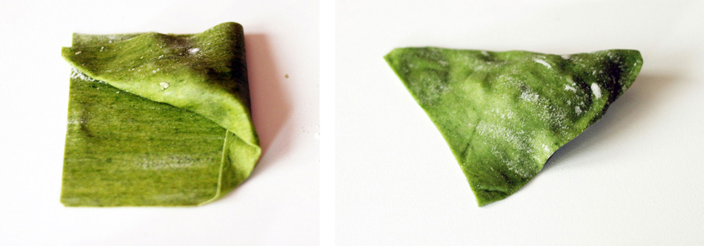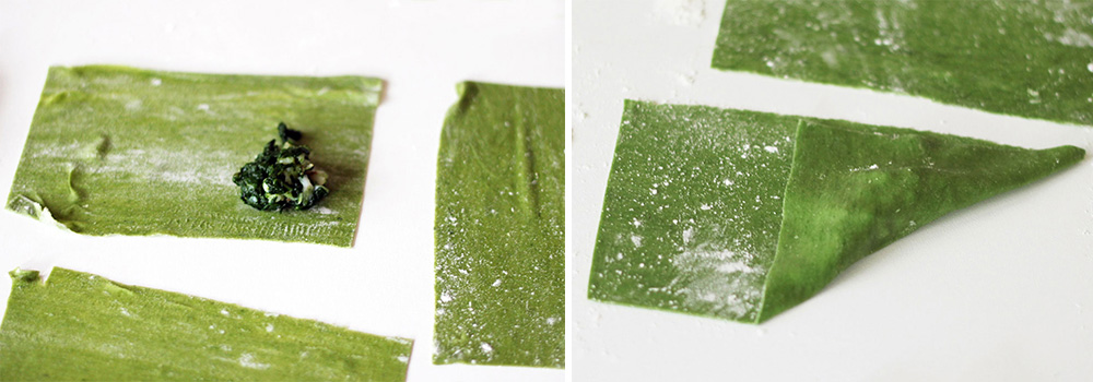 English. Place a tablespoon of the filling onto the base of each rectangle. Fold the pasta sheet from the base towards the height side: fold twice again to obtain an (almost) perfect little triangle: in the pictures above you can see the whole step-sequence.