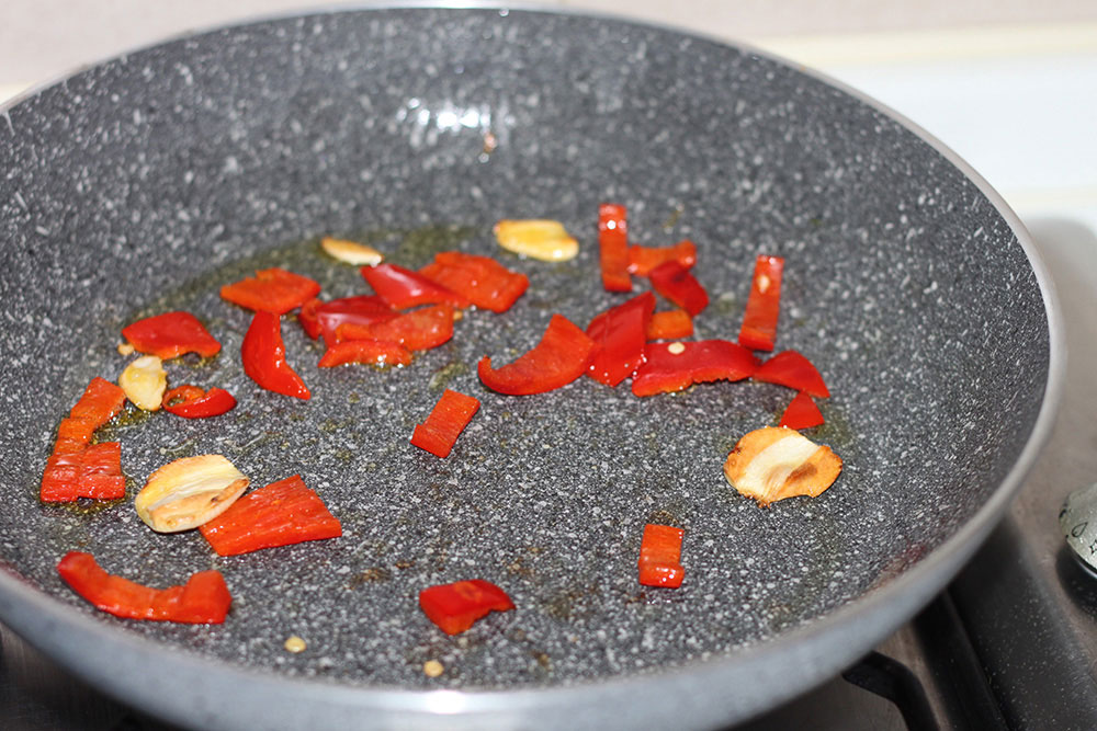 Place 4 tabsp. of oil into a pan, add the cleaned clove of garlic, some chopped chilli (up to your taste) and make it fry until the garlic turns into “blond”.