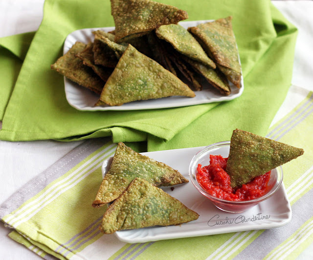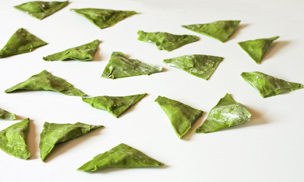English. We reivented the samosas, giving them an Italian imprinting. How? We used the lasagna dough. But not the “usual” one (made with eggs and flour): we used the green lasagna dough, made with eggs, flour and spinach.