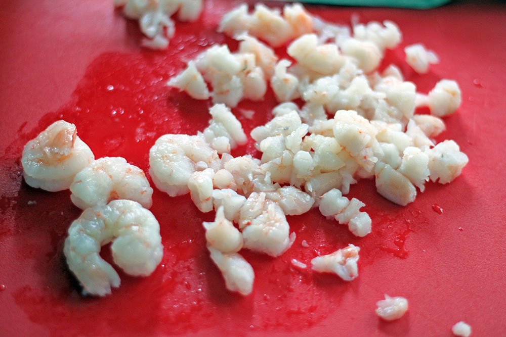 English. Meanwhile, clean the shrimps and coarsely chop. Add the chopped shrimps to the leftover spinach: place in a bowl and add a pinch of salt and a generous pinch of freshly ground black pepper. Combine. This is the filling of the samosas.